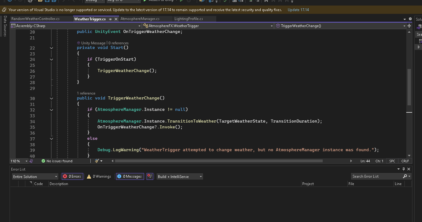 The system is driven entirely by ScriptableObject profiles, allowing full customization of lighting curves, gradient colors, particle effects, and ambient audio without editing a single line of code. Utility components like RandomWeatherController and WeatherTrigger provide event-driven or automated transitions for seamless integration into UI buttons, cutscenes, or background simulation.