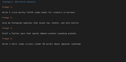 - Categorized layout: Shortform, Longform, Visuals, Engagement